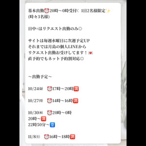 | お店からのメッセージ | ★店長からの一言★ SweetRoomプラチナガールの一人!! スタイル抜群スレンダーセラピスト!! 経験豊富なのにもかかわわらず、日々劣ることなく研ぎ澄ます技術、 彼女が贈るそのひと時と、間違いない0距離施術は納得の一言!! “これぞメンズエステの施術”と お褒めの言葉を沢山いただいております。 一度はお会いして損はない女性です!! ※予約困難により事前予約をお勧めします!! 出勤日数が少ない為、出勤リクエストも受付中 ☆女の子からのメッセージ☆ チャームポイントは唇🫦 エステ歴は長い方ですが マッサージするのが凄く大好き😘 密着♡密着♡ 0距離ながらのしっかり施術が得意です👍 他では味わえんお肌0距離エステを堪能せんと損ですよ(*˘ ³˘)♡ 心身、楽しい癒やしのお時間を過ごしに来てください♡ いつも頑張っている貴方へのご褒美に…♡ お昼はご予約のみ! 出勤リクエストは個人LINEからお受けしてます💌 直予約の個人LINE▶https://lin.ee/fwRhN5X リットリンク▶https://lit.link/tsukishimachanmika ◇指名料込み料金◇ 80分→¥16000円 100分→¥20000円 120分→¥22000円 150分→¥26000円 180分→¥30000円 延長30分→¥6000円 延長60分→¥12000円 ●本指名の場合はプラス¥1000円 ●会員様はカード手数料無料+5分延長 ●ネット予約割のみ可能、その他割引不可 ●プラチナネット予約限定5分延長+1,000円オフ ※予約は24時間受付のネット予約最優先での対応 |