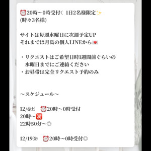本日22時50分〜🈳 2025/12/06 07:45:22 今日居てるわ♪空き枠も出しました😊サイトはまだなのでLINEよりお受けしてます💌 X ▶ https://twitter.com/11_chanmika_11直お問い合わせ個人LINE▶ https://lin.ee/fwRhN5Xリットリンク▶https://lit.link/tsukishimachanmika月島みか🌹